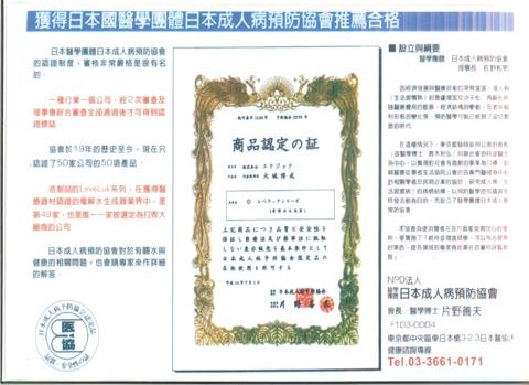 | 日本成人病預防協會為最嚴謹的醫學團體,由超過6,600多位註冊醫生組成,經嚴謹測試、審查和臨床認証,真正能有效改善身體健康、預防疾病,並一致認同才可獲獎。 | |